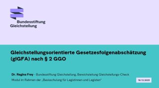 Eine Form des Gleichstellungs-Checks ist die gleichstellungsorientierte Gesetzesfolgenabschätzung (glGFA). Sie hat zum Ziel, systematisch die Gleichstellungswirkungen eines Gesetzes bzw. Regelungsvorhabens zu identifizieren und unbeabsichtigten Folgen entgegenzuwirken. Die Notwendigkeit einer solchen Prüfung ergibt sich zum einen aus dem Verfassungsauftrag zur Förderung der tatsächlichen Durchsetzung der Gleichberechtigung von Frauen und Männern gemäß Art. 3 Absatz 2 Satz 2 GG sowie aus § 2 der Gemeinsamen Geschäftsordnung der Bundesministerien (GGO) in Verbindung mit §§ 43 Absatz 1 Nr. 5, 44 Absatz 1 GGO.