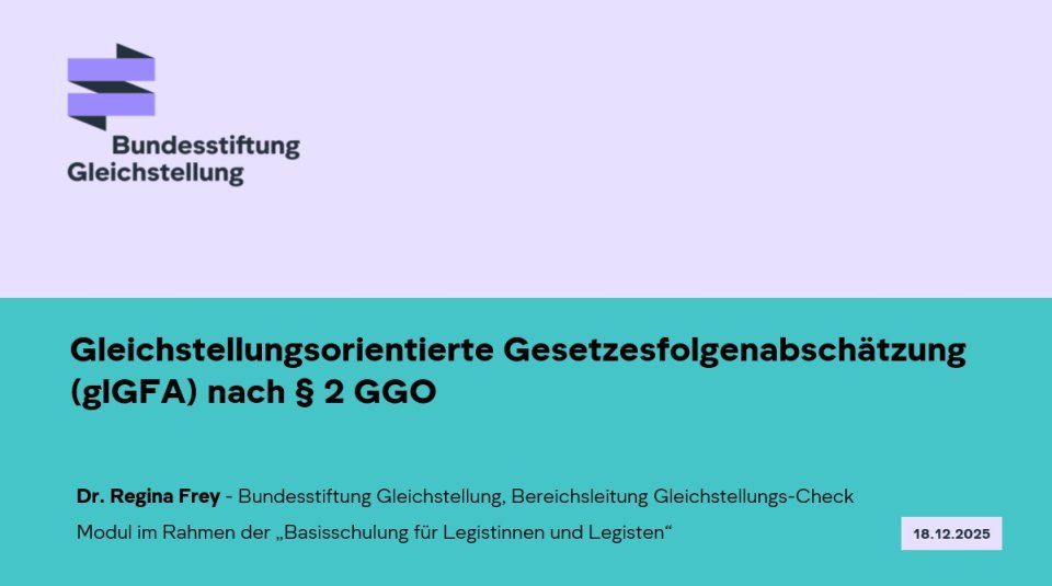 Der Bereich Gleichstellungs-Check der Bundesstiftung war eingeladen, an der Schulung „Bessere Rechtsetzung“ im BMDS am 18.12.2025 mit einem fachlichen Beitrag teilzunehmen.